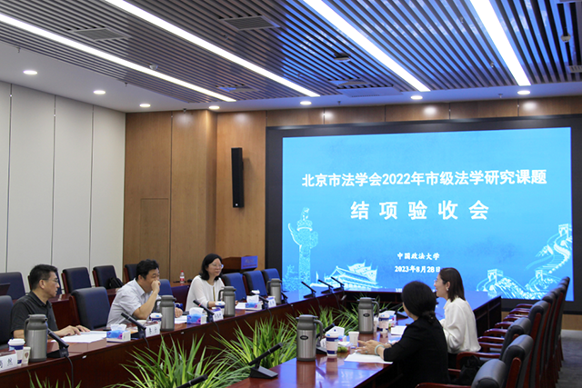 2023年8月28日下午,北京市法学会2022年市级法学研究课题部分重点课题结项验收会在中国政法大学召开。会议验收了两个重点课题的结项成果,分别是:曹鎏教授主持的“习近平法治思想的北京实践——以法治政府建设为视角”课题、李爱君教授主持的“数字经济安全法治保障研究”课题。北京市法学会党组书记、专职副会长郭旭升,一级巡视员李宁出席会议。