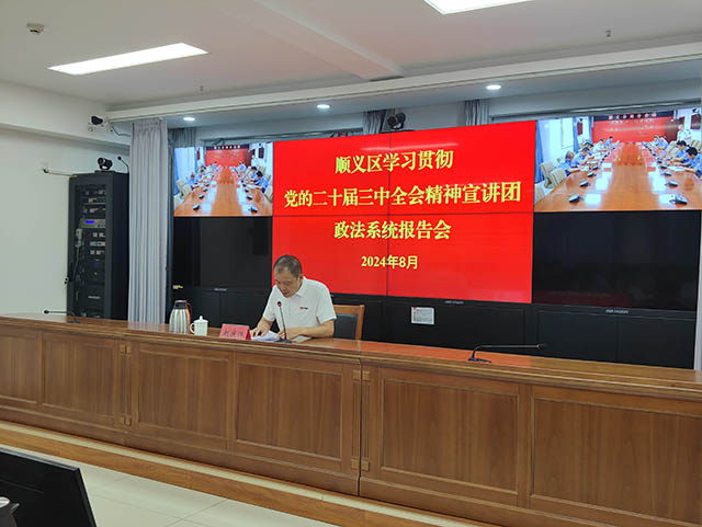 8月20日下午,顺义区法学会联合区委政法委组织召开学习贯彻党的二十届三中全会精神报告会,区法学会常务副会长、区委政法委分管日常工作的副书记赵庆江同志主持会议,并就认真学习贯彻落实全会精神作宣讲报告。区政法各单位基层党组织书记、区委政法委全体机关干部及部分会员代表、首席法律咨询专家通过线上线下相结合的方式聆听了报告会。